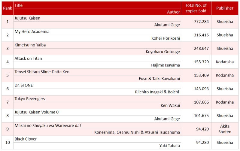 Top 10 mangas par série vendus du 5 au 11 avril 2021.