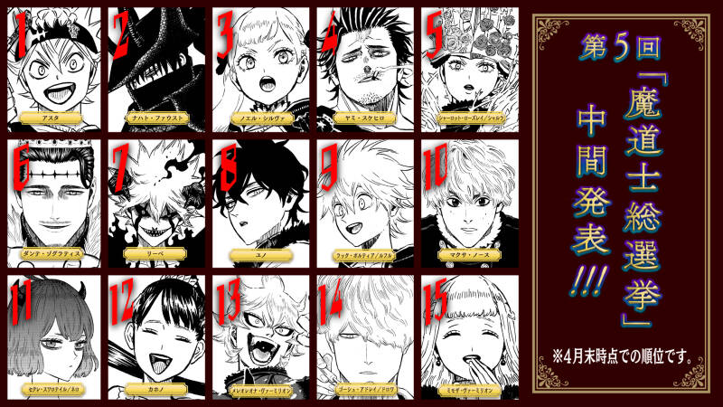 -Le top 15 provisoire du sondage de popularité des personnages de Black Clover a été dévoilé. Le sondage se terminera le 31 Mai.