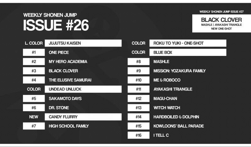 Colors Pages : 4 mangas ont reçu une page couleur à savoir Jujutsu Kaisen, Undead Unluck, Blue Box et le One Shot Roku To Yuki.
