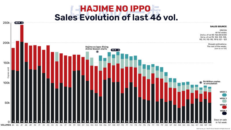 Voici une charte graphique montrant l'évolution des ventes de Hajime no Ippo.